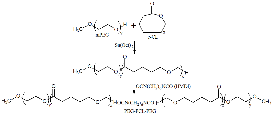 Preparation of the PEG-PCL-PEG (PECE) triblock copolymer: PECE triblock copolymers were prepared by ring-opening polymerization of ɛ-CL using Sn(Oct)2 as catalyst and continued by coupling reaction using HMDI as coupling agent is illustrated in fig. 1. In the first step amount of mPEG, ɛ-CL, and Sn(Oct)2 were introduced into a 50 ml filter flask under vacuum. The mixture was reacted with magnetic stirrer at 120 °C for 6 h. After that HMDI was added into the mixture and continued the reaction at 80 °C for 6 h. After reaction, the results obtained was purified with dissolved in dichloromethane and then precipitated with cold petroleum ether. Purification was repeated twice. The PECE triblock copolymer was dried in room temperature after that dried polymer was storage in airtight container [5].