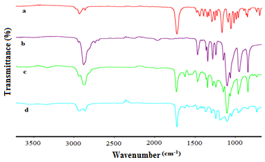 Fig. 2: Spectra FTIR of (a). ɛ-CL, (b). mPEG2000, (c). PECE triblock copolymer 0.5:1, and (d). PECE triblock copolymer 2:1
