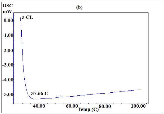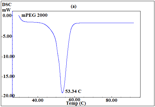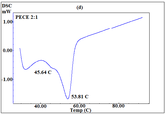 The (a) and (b) curves are the thermal curves of mPEG2000 and ɛ-CL. Both curves indicate that there is only a single peak melting point of the compound that is at temperatures 53.34 °C and 37.66 °C that each is a melting point of the compound mPEG2000 and ɛ-CL. The (c) and (d) curves are the thermal curves of the PECE triblock copolymer with a ratio of PCL/PEG are 0.5:1 and 2:1. The thermal curve of the PECE triblock copolymer indicates the existence of 2 peaks of melting point temperature although the peak is not clearly separated. The low melting point temperature of both curves is at 50.98 °C and 45.64 °C, which is the temperature of the melting point of the PCL block in the crystal phase and the high melting point temperature peak is at 54.78 °C and 53.81 °C as melting point for the mPEG block in the crystal phase. The thermal properties of a single polymer and the PECE copolymer triblock that produce curves with a single peak and multiple-peak are also reported in previous studies [8, 10].