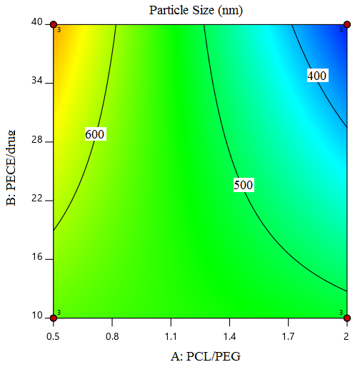 The interaction between factors of PCL/PEG ratio and PECE/drug ratio affects the particle size decline. The greater of PCL/PEG ratio and PECE/drug ratio then the resulting particle size is smaller. A greater ratio of PCL/PEG and PECE/drug can reduce particle size by lowering the effects of colloidal steric stability caused by the weight of large PEG molecules and due to the formed micelle copolymer can ensnare drug adequately, respectively [12, 14]. Effect of interactions between factor ratio of PCL/PEG and PECE/drug on the particle size response is depicted with a contour plot in fig. 5.