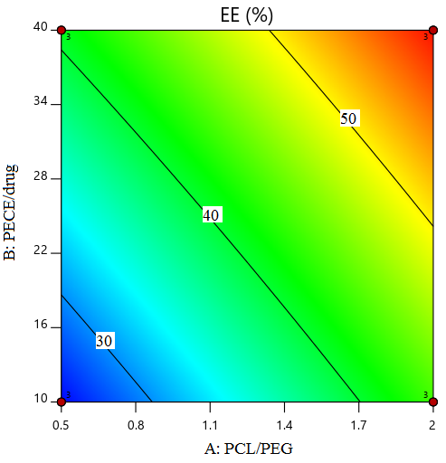 The interaction factors of PCL/PEG ratio and PEG/drug ratio affects on EE decline. The greater of PCL: PEG ratio and PECE/drug ratio can lower the PECE triblock copolymer ability to ensnare the drug. It is possible because in a large ratio to the two factors of the micelle copolymer have suffered saturation so that EE values are constant or can decrease [15]. Contour plot influence of interaction two factors can be seen in fig. 7.