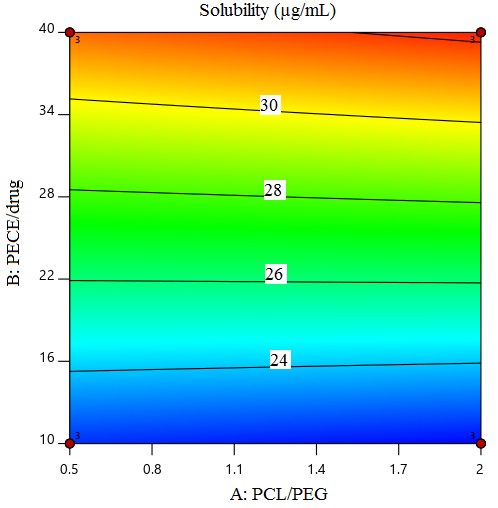 Fig. 9: Contour plot effect of interactions factor ratio of PCL/PEG and PECE/drug on the drug solubility