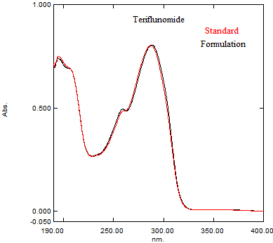 The specificity of the method was assessed by comparing the UV absorption spectra and absorbance maxima of standard TEF with the formulation as depicted in fig. 4. The spectra of both standard and formulation showed absorbance maxima value indicating the good specificity of the method.