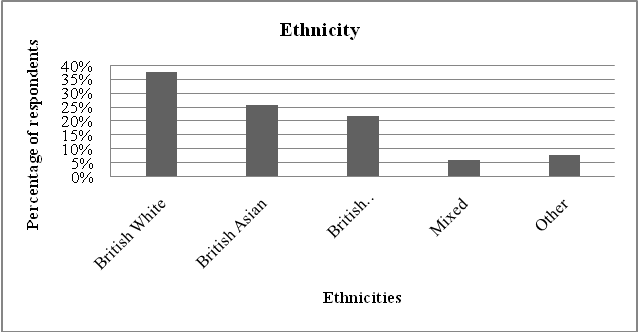 More females (64%) than males (36%) participated in this study, accordingly data was analysed as percentage rather than counts of frequencies. Similarly, there were more 18 to 24-year old (52%) than all other age groups (26% in 25-34 y-group, 10% in 35-44 y-group, 6% in 45-54 y-group and 6% in the 55+years-group). Fig. 1 shows the sample ethnicity breakdown.