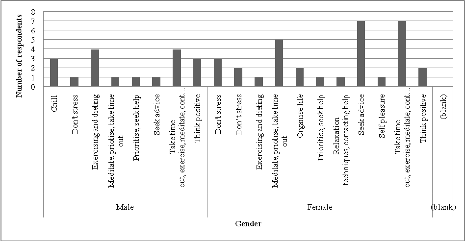 Exercising is vital for maintaining mental fitness and is effective in reducing fatigue, improving alertness and enhancing overall cognitive function. It also helps restore depleted energy levels and ability to concentrate. Regular participation in aerobic exercise decreases mental and physical tensions, stabilises mood and improves self-esteem, thereby reducing stress [11]. Support groups may also be important; sharing information with those who have ‘been there’ is highly effective when coping with symptoms. However, support groups are mainly designed for those that have already been diagnosed with a mental health disorder, for example, anxiety and depression [12]. However a problem in coping, which this investigation showed was that people under stress tend to confide in people close to them rather than people who would have the appropriate knowledge and skill to help [13].