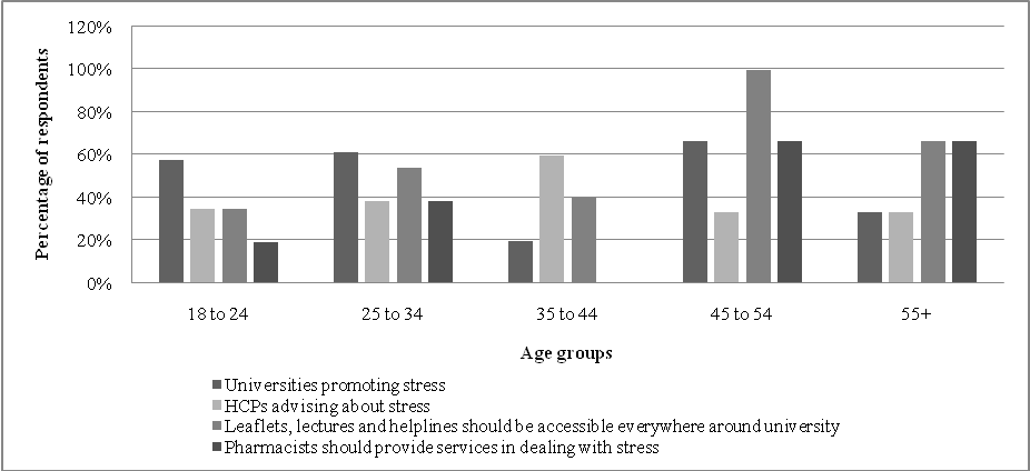 Around half of males and females believed that universities should be educating students about stress (50% and 56% respectively) with health care professionals advising about stress coming second in both genders at 33% and 41% respectively. However, only 22% of males and 28% of females selected ‘the community pharmacist should be the point of education.’