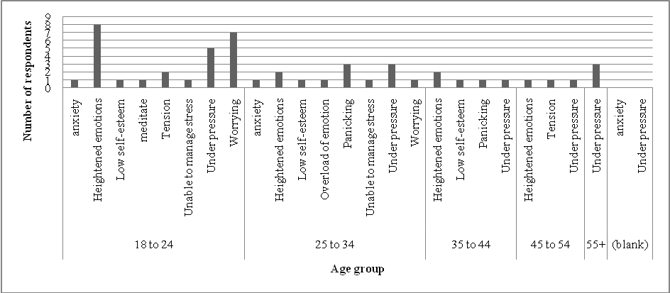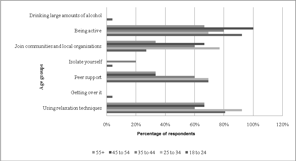 Fig. 2 shows the breakdown of responses; the most selected options were: ‘take time out’ and ‘exercise.’ One in five (19%) of all 18-24-year old selected ‘exercise and diet’, where 31% of the 25-34 y olds chose the ‘take time out option’ and in the 35-44 y old ‘thinking positive’ was the most selected option at 40%. In the45-54 age group the ‘taking time out ‘option was their preferred answer (67%). Only in the 55+age group was ‘seeking advice’ the most popular response (67%). Thirty two percent of BW chose ‘take time out’ and the majority of B Aselected ‘do not stress’ (31%). B Cselected most options (meditating, prioritizing and taking time out [36%] and exercising, contact support whilst taking time out [36%]).