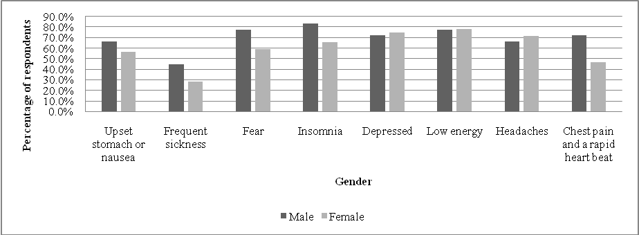 Males selected insomnia (83%) as the most common symptoms of stress followed by depressed (72%). Females’ participants chose low energy as sign of stress followed closely by feeling depressed (75%), (fig. 5).