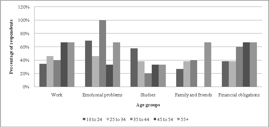 Responses by age group are illustrated in fig. 6. Majority of BW and BA participants selected emotional problems (74%, 85% respectively). BC selected financial obligations (55%) and emotional problem (55%) as biggest risks of stress. ME selected work and chose studies as biggest stressors (100%).