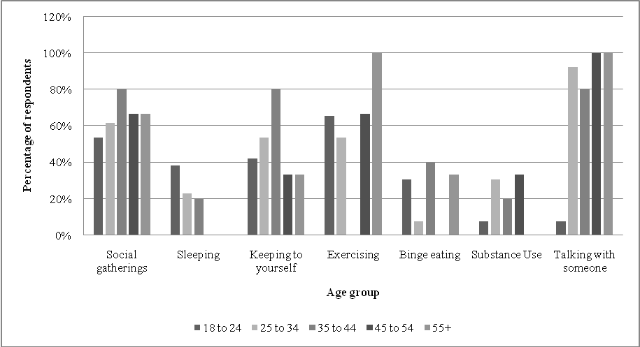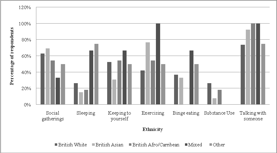 Males and females selected talking with someone as a good method to deal with stress (94%, 81% respectively). However, when analysed results by age (fig. 7 and ethnicity (fig. 8) the difference was more significant.