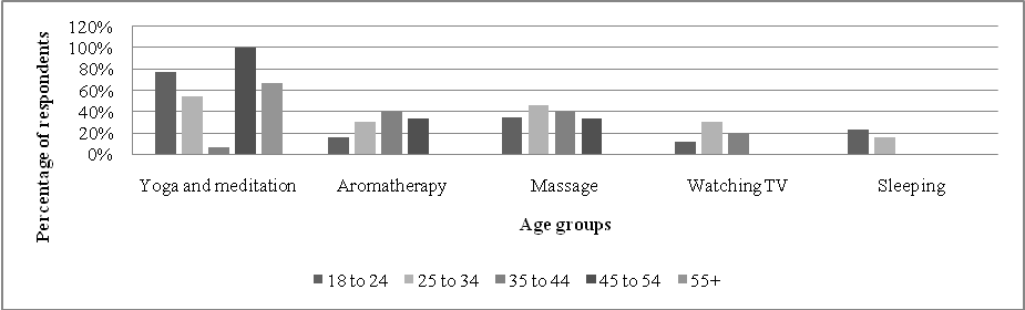 Majority of male and female participants selected yoga and meditation would be the best treatment (61% and 69%). Age groups analysis is illustrated at fig. 12. There were significant differences when the result was analysed by ethnicity. BW, BA and ME selected yoga and meditation (63%, 69% and 100%). BC selected yoga and meditation (55%) followed by massage at 45%.