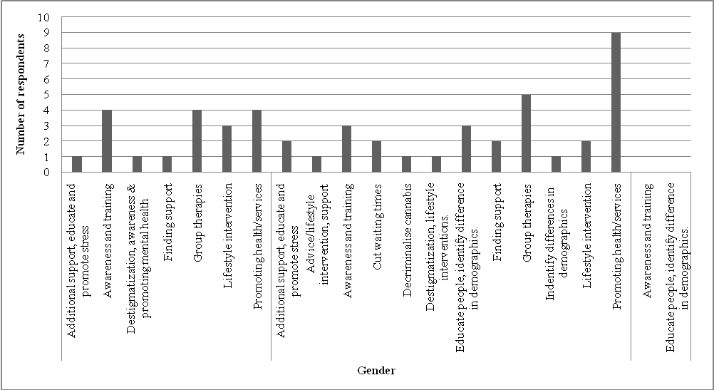 Male participants believed that group therapies (22%), awareness and training (22%) alongside promoting health services (22%) would help. Females who believe promoting health services is the best option was 28%, (fig. 13). Out of all 18-24 age group participants 23% selected ‘health services’, 54% of 25-34 age group selected ‘group therapies’, 80% of the 35-44 age group selected ‘health services’, 67% of 45-55 age group selected the ‘awareness and training ‘option, where 33% of the 55+participants selected awareness, training and health services. Out of all participants, BW (32%), BA (39%) and ME (33%) participants selected ‘health services’ and BC selected group therapies (27%).