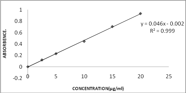In this 10 mg of the drug (efavirenz) was accurately weighed and transferred into 10 ml volumetric flask, dissolved it is in a few ml of methanol and was made up to 10 ml to get a concentration 1 mg/ml stock solution. From the stock solution, further dilutions were made with SLS (2%w/v) to get the concentrations ranging from 2.5 μg/ml to 20 μg/ml. The absorbance was measured at 247 nm in UV-Visible Spectrophotometer. The absorbance was plotted against concentrations of drug vs time as shown in fig. 1. The method obeyed Beer's law in the concentration range of 2.5-20 μg/ml.