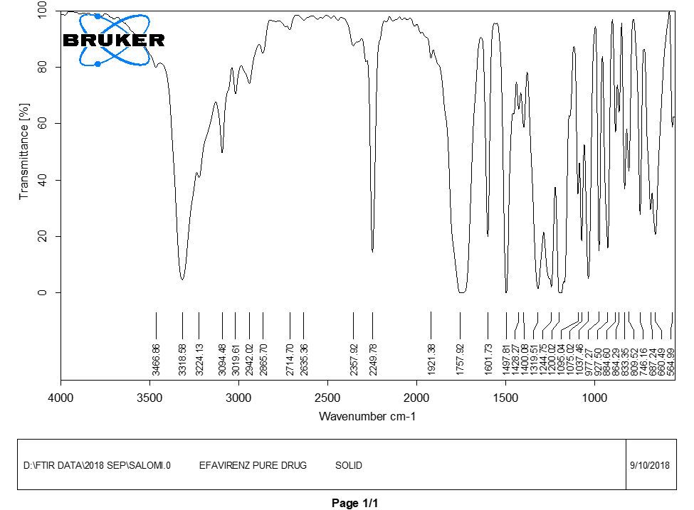 FT-IR spectra of efavirenz and various papers were recorded in the range of 400 to 4,000 cm−1 using a Jasco-FT-IR spectrophotometer (Jasco, Essex, UK) by the KBr disc method. The spectra are shown in fig. 2