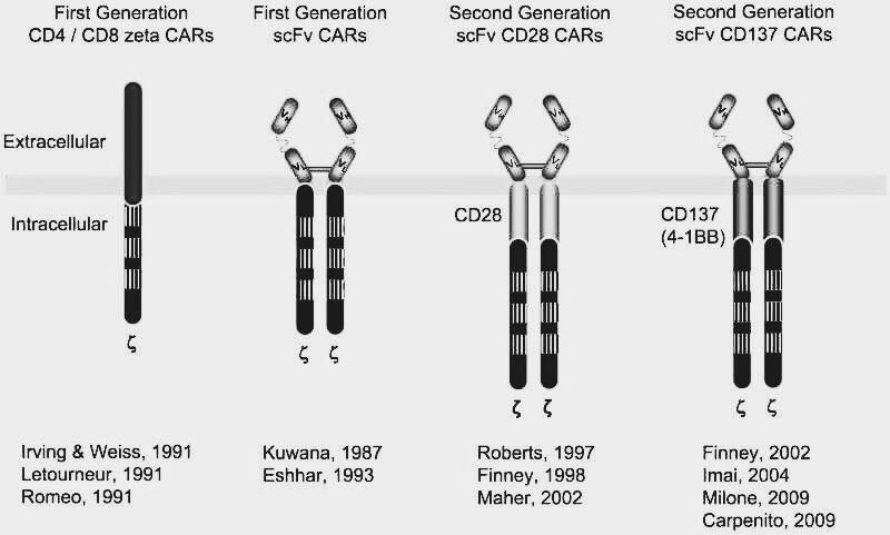 Fig. 2: A drawing of CAR T cells. Showing that 1st generation possess CD3zeta chain, or other comparable signaling domains. While 2nd generatione hav CD28 or CD137 signaling domains as they were originally described by Kuwana and Helene Finney