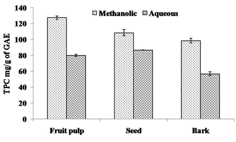 Twenty grams of the dried and powdered plant sample of TB fruit pulp, seed and bark was extracted with 70% methanolic solvent (in distilled water) and aqueous system for overnight at room temperature in an orbital shaker. The methanolic fruit pulp (MEFP), seed (MES), bark (MEB) and aqueous fruit pulp (AQFP), seed (AQS) bark (AQB) extracts were separated from the residues by filtering through Whatman No. 1 filter paper. The residues were extracted until decoloration with the same fresh solvent and extracts combined. The combined extracts were concentrated and freed of solvent under reduced pressure at 40 °C by using a rotary evaporator and lyophilized till dryness. The dried crude concentrated extracts were stored at-4 °C and used for the antioxidant activity determination.