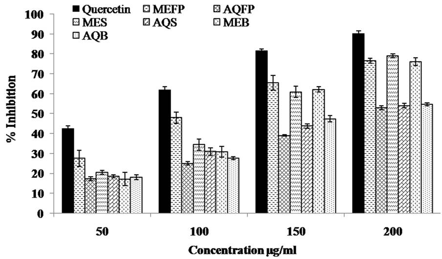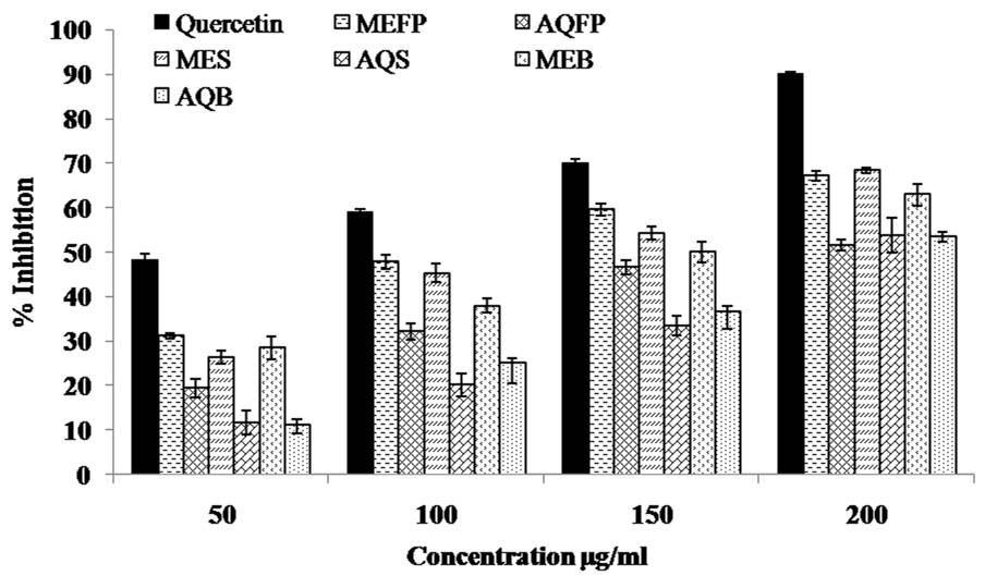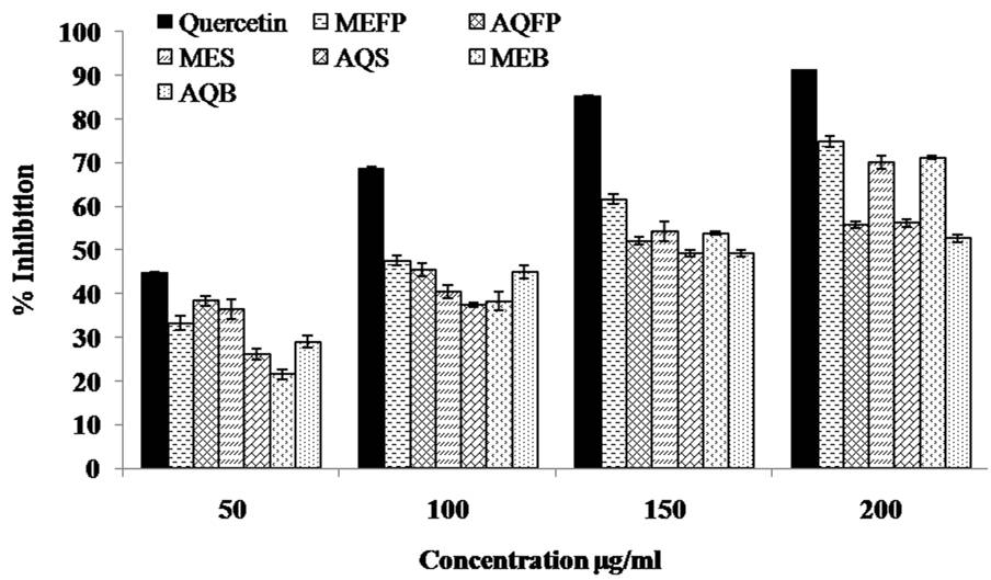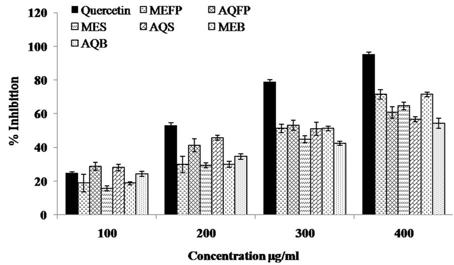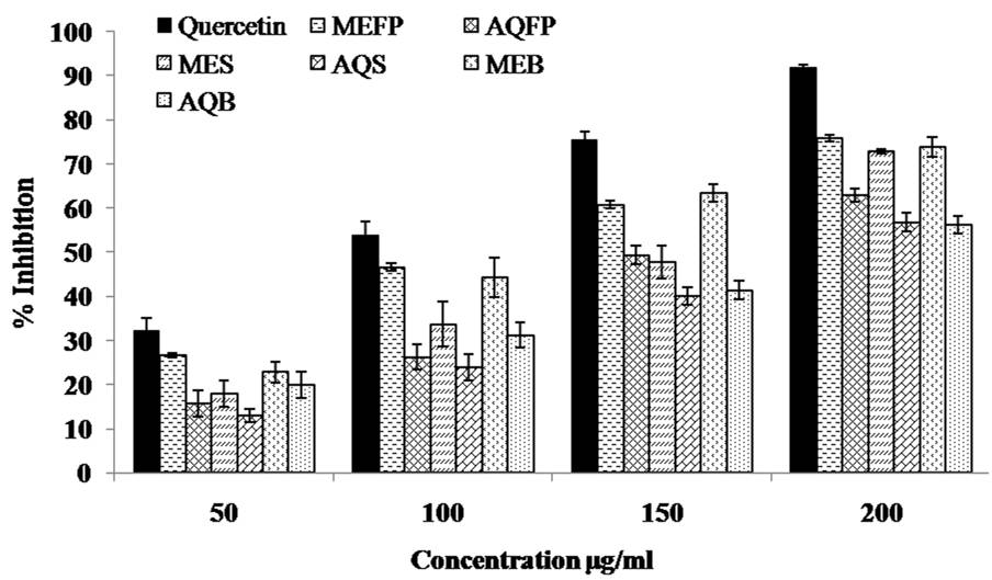 In tested extracts, methanolic extracts showed maximum inhibition (76.08% to 79.78%) than aqueous extracts (53.00% to 54.80%) to inhibit production of FRs which initiates oxidation of lipids and proteins. Quercetin showed 92.12% inhibition to inhibit the production of peroxides. The inhibition is increased with increasing concentration of the extracts from 50 to 200 μg/ml in the reaction mixture and the maximum inhibition was shown by MES (79.78%) (fig. 6). The IC50 of methanolic extracts was in the range 184.98 (MEFP)>212.5 (MES)>221.4 (MEB).