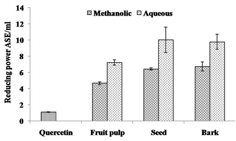 The RP of a compound may act as a significant indicator of its potential antioxidant activity [19]. With regards to RP, higher reducing capacity might be attributed to the higher amount of phenolic compounds. Methanolic extracts had significantly high Fe3+to Fe2+transformation capacity (6.73 to 4.68 ASE/ml) than aqueous extracts (10.03 to 7.25 ASE/ml) in comparison to standard quercetin (1.12 ASE/ml) (fig. 7), showing high phenolic content in methanolic extracts.