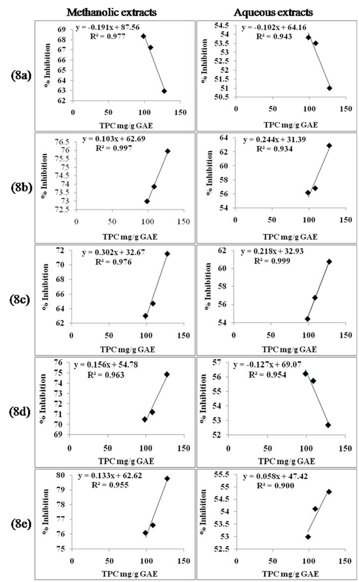 Phenolics are the major contributors to the antioxidant activity. The correlation between TPC and FRSA of methanolic and aqueous extracts had a correlation coefficient of R2 = 0.977 (y =-0.191x+87.56) and R2 = 0.943 (y =-0.102x+64.16). A good correlation also exists between TPC and other antioxidant activities (fig. 8).