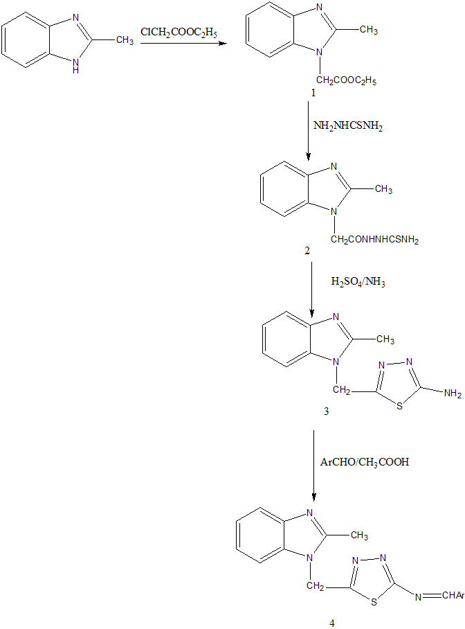 Results: The reaction sequence involves microwave-induced preparation of N1-Ethylacetate-2-methyl-benzimidazole (1) from reaction of 2-methylbenzimidazole with ethyl-chloroacetate. Further reaction with thiosemicarbazide gives N1-acetylthiosemicarbazide-2-methyl-benzimidazole (2). The compound (2) on dehydrative annulation by sulfuric acid gives N1-(2’-amino-5’-methylene)-1’,3’,4’-thiadiazole-2-methyl-benzimidazole(3), which on condensation with various aromatic and hetero aromatic aldehydes gives N1-(2-substituted-Benzylidene-imino-5’-methylene)-1’, 3’, 4’-Thiadiazole]-2-methyl-benzimidazole(4a-4l). Which were characterized by IR and 1H NMR spectral data.