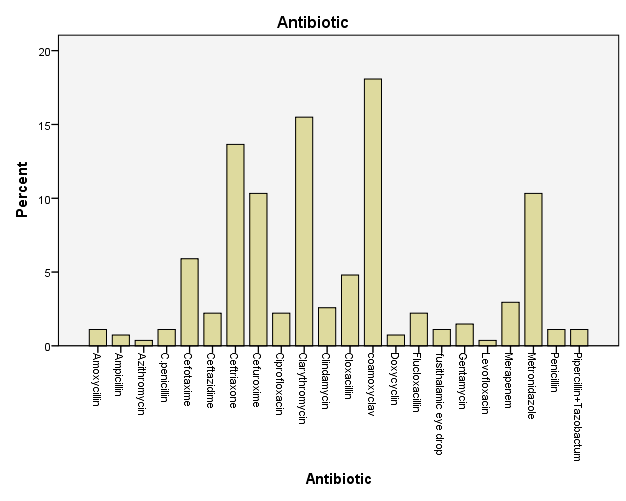 Additionally, in this study found that the top five antibiotics were amoxicillin/clavulanic acid (18.1%), clarithromycin (15.5%), ceftriaxone (13.7%), cefuroxime and metronidazole (10.3% for both) and cefotaxime (5.9%). An observational study on utilization of parenteral anti-infective agents in the ETU of a tertiary care hospital has found that 400 patients (45.2%) received parenteral anti-infective agents. According to their results, cephalosporin, aminoglycosides and metronidazole had accounted for about 70% of total antimicrobial used. Another study (n=885 patients) found that 45.2% (n=400) of all patients received parenteral anti-infective agents. Cephalosporin, aminoglycosides, and metronidazole accounted for about 70% of total antimicrobial use [23]. Ojeniran et al. (2010) found that antibiotic prescribing in ETU was 14.5% of all prescribing of which 42% were broad-spectrum antibiotics [4].