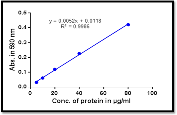 0.1 mg of NpTiO2 was dissolved in 1.0 ml of double distilled water (ddH2O) in PH=5.2 (by added few drops of acetic acid in 0.1M and stirring for about 2 h). 100 µl Streptokinase in concentration 1.0 mg/ml was added to 0.1 mg/ml NpTiO2 drop wise with stirring for about 4 hour in 4 ᴼC [7, 8]. Then mixed were centrifuged in 10000 rpm [9], supernatant was removed and pellet washed three time with double distilled water than FT-IR analysis and Ninhydrine’s test were carried out as qualitative tests whereas Bradford protein assay (Coomassie Brilliant Blue) were used to estimation concentration of streptokinase in nanoparticles as quantitative tests [10, 11] using series of bovine albumin in concentration from (5 µg/ml to 80 µg/ml) as in fig. (1) to confirmed streptokinase was loading in nanoparticles. The standard curve linear regression equation was gotten by using the GraphPad prism program (version 6), then the OD values of the samples streptokinase were applied to calculate the corresponding sample’s concentration.