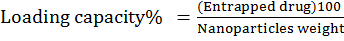 Entrapped efficiency (EE) and loading capacity (LC) were determined depending on the concentration of nanoparticles as in equation (1) and (2). Seven samples of nanoparticles having series different concentration (0.05 mg/ml) to (1 mg/ml). Streptokinase concentration was at range (1 mg/ml) and PH=5.2 [12]. streptokinase released from Titanium nanoparticles were studied using streptokinase loading nanoparticles that immersed in 5 ml of Phosphate buffer saline (PBS) at PH (7.4) then concentration of streptokinase in supernatant was determined in seven different interval times for 24 h [13] using Bradford protein assay. Cumulative streptokinase release was measured.