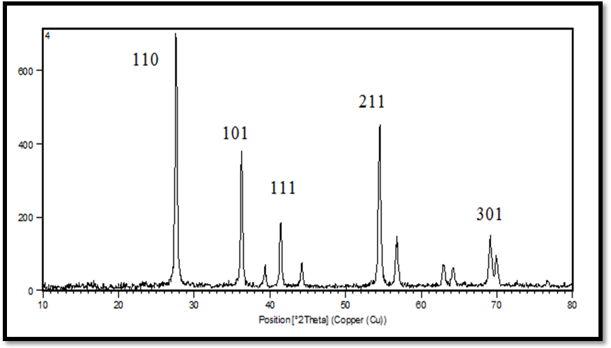 X-ray Diffract meters (XRD) of Titanium dioxide nanoparticles showed in fig. (6), according to reference (00-001-1292) and the peaks at positions 27.507ᴼ, 36.041ᴼ, 41.187ᴼ, 54.233ᴼ and 68.999ᴼ corresponding to (110), (101), (111), (211) and (301) respectively reflection of tetragonal with α and β =4.5800ᴼ [22]. The size of nanoparticles crystal was (31 nm) calculated by (Xpert high score plus program 3th version) using the Sherrer equation.