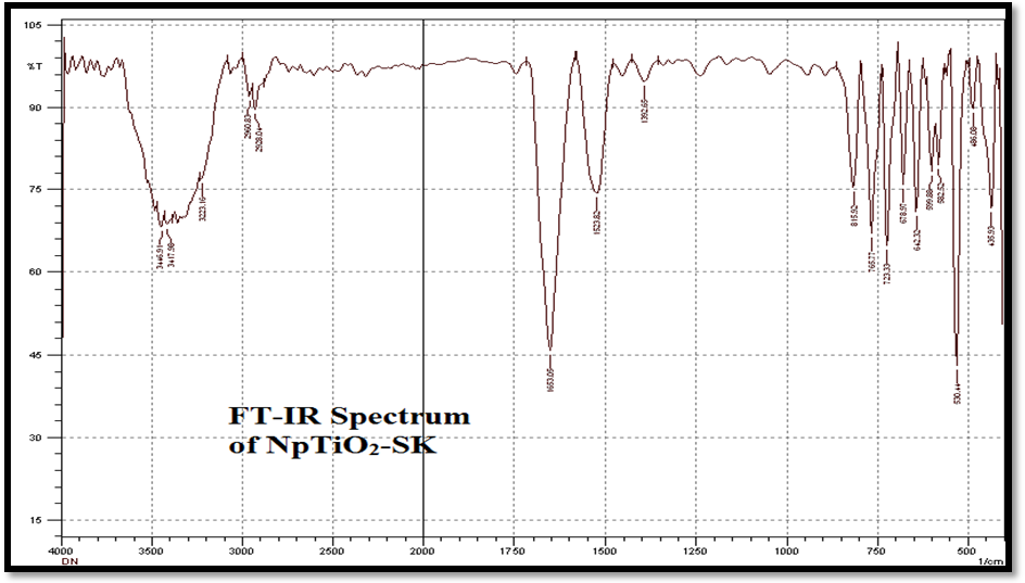 Titanium dioxide nanoparticles (NpTiO2) are manufactured worldwide in large quantities for using in a wide range of medical and chemical applications. Titanium nanoparticles show different physicochemical characterizes [18]. FT-IR spectroscopy analysis of Titanium nanoparticles (NpTiO2) in fig. (2) Show a broadband in (3400 cm-1) revealed to the interaction of hydroxyl groups of water molecules with TiO2 surfaces. The peak at range (1620 cm-1) is revealed to bending vibration of hydroxyl groups, whereas, broad peaks at range (1650 cm-1-500 cm-1) refer to bending vibration of interaction (Ti-O-Ti) bond [19, 20].
