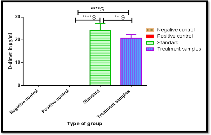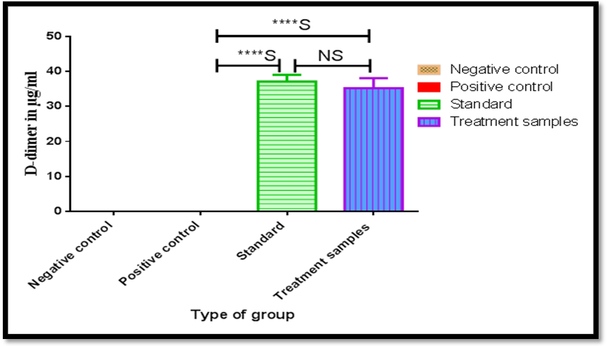 Fig. 11: D-dimer value in blood samples after 120 min of treatment with NpTiO2-SK, n=10, p value ≤ 0.05. S= significant, NS= non-significant
