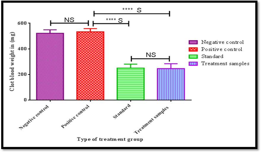 Fig. 12: Clot blood weight in mg of blood samples after treatment with NPs-TiO2, n=10, P value ≤ 0.05 S= significant, NS= non-significant