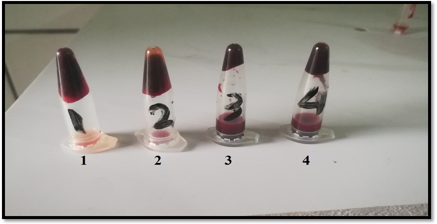 Thrombolytic activity study was carried out in vitro depending on previous studies method of thrombolytic agent [14, 15]. 2.0 ml of blood samples were collected from human volunteer (N=10) and the consent form was signed by all patients volunteer. These (2.0 ml) were divided and transferred in to four micro tubes (500 µl/tube) incubated at 37 ᴼC for 45 min until blood clot is formation, than the blood clot in tubes are treated as following.