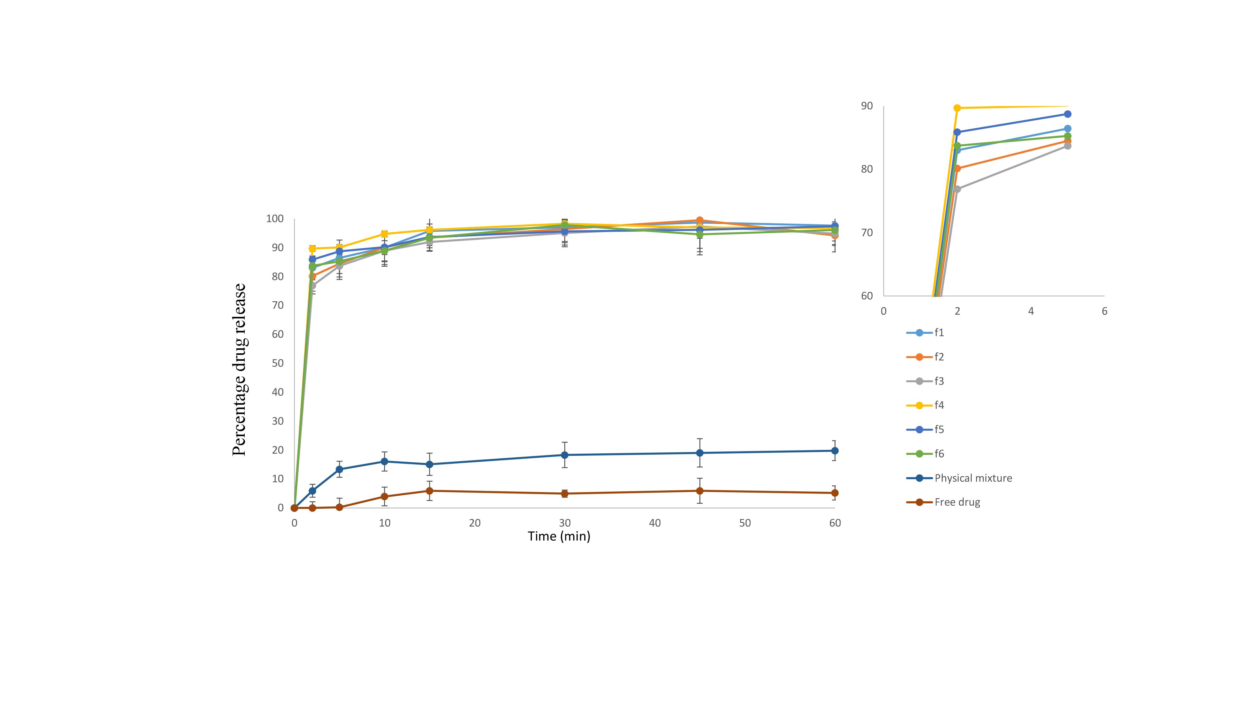 The dissolution enhancement is clear where more than 80% of the loaded drug was released within 2 min while the drug/polymer's physical mixture demonstrated a minor release of 8.5% and an insignificant release for the free drug of 5.3% within the same period. The release of the physical mixture and the free drug didn’t change noticeably over 60 min where the physical mixture release didn’t exceed 15 % while the drug maintained at 5.5 % as illustrated by fig. 1.