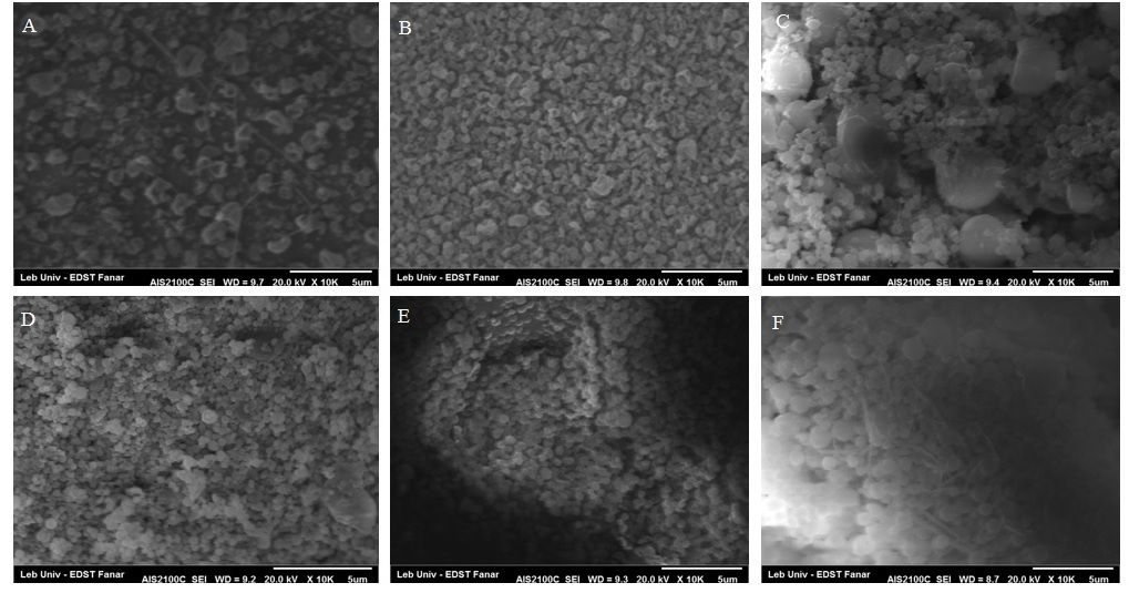 Fig. 2: Scanning electron microscopical images of tadalafil-loaded nanospheres samples, F1 (A), F2 (B), F3 (C), F4(D), F5(E), F6 (F)