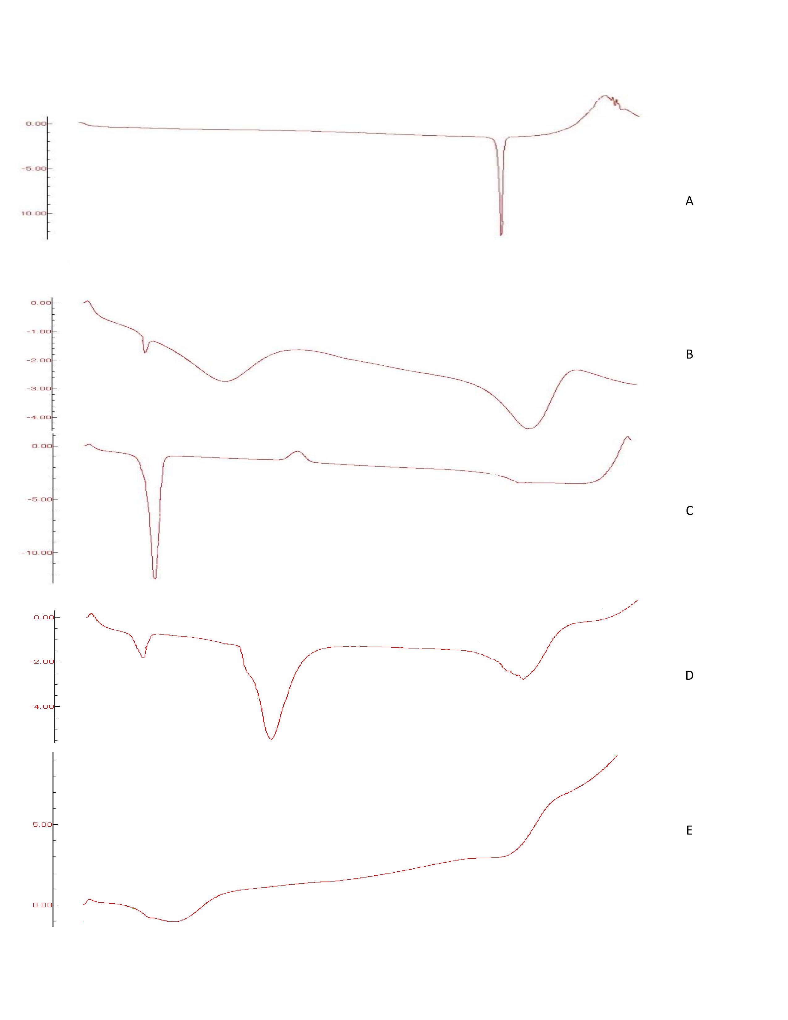 Fig. 3: DSC thermograms of (A) tadalafil (B) PVP, (C) PEO, (D) physical mixture,(E) tadalafil-loaded nanospheres