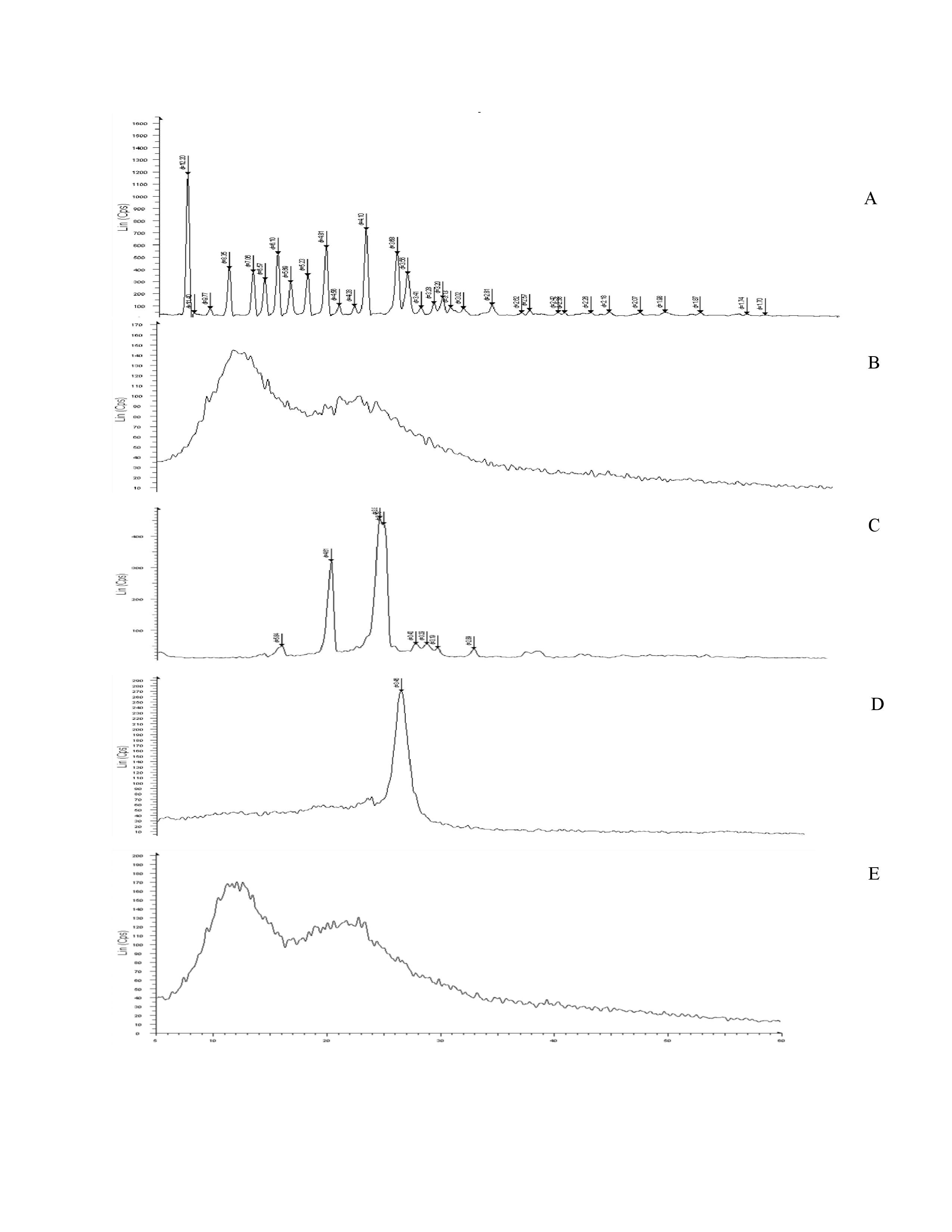 Fig. 4: X-ray diffraction patterns of (A) tadalafil (B) PVP, (C) PEO, (D) physical mixture, (E) tadalafil-loaded nanospheres