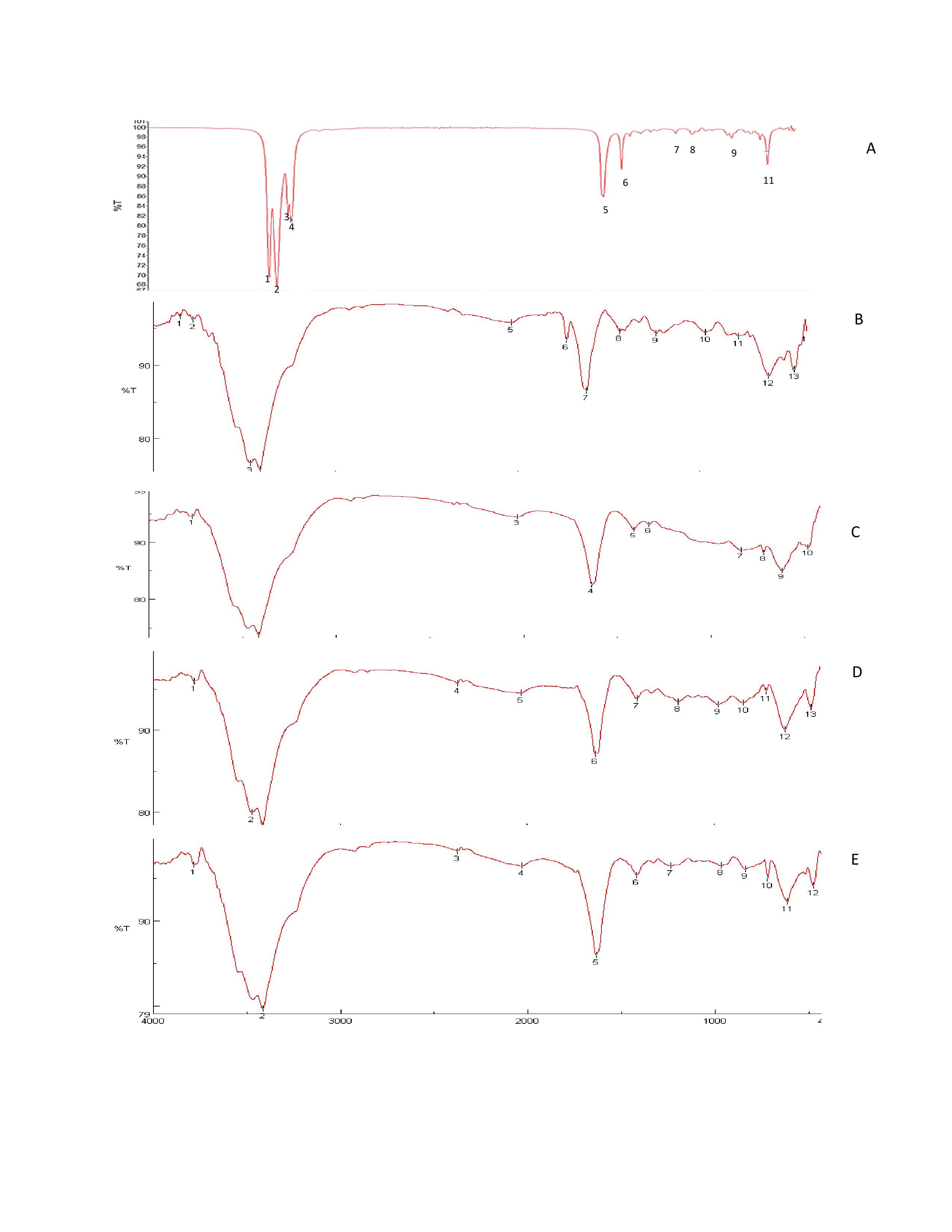 Fig. 5: FTIR spectra of (A) tadalafil (B) PVP, (C) PEO, (D) physical mixture, (E) tadalafil-loaded nanospheres