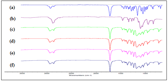 Fig. 1: FTIR spectra of ɛ-CL (a), PEG (b), PCEC triblock copolymers for the ratio of PCL: PEG 2.0:1 (c); 2.5:1 (d); 4.0:1 (e); and 5.0:1 (f)