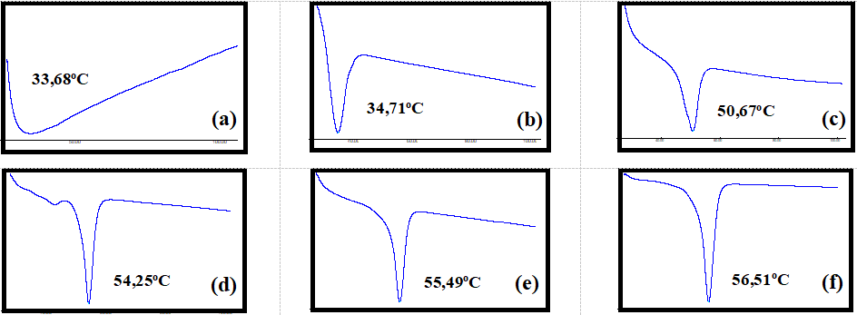 The DSC thermogram of the synthesized PCEC triblock copolymers based on parameters of thermal properties (melting points) is displayed in fig. 2. In PEG and PCEC triblock copolymers, physical changes occur from solid to liquid which shows the endothermic transition (sample absorbs heat). The melting points of the PCEC triblock copolymers for the ratio of PCL: PEG 2.0:1; 2.5:1; 4.0:1; and 5.0:1 respectively were 50.67 °C; 54,25 °C; 55,49 °C; and 56.51 °C. These show that the greater the ratio of PCL: PEG, the longer the chain structure of PCL so that the higher the melting point of PCEC triblock copolymers [12].