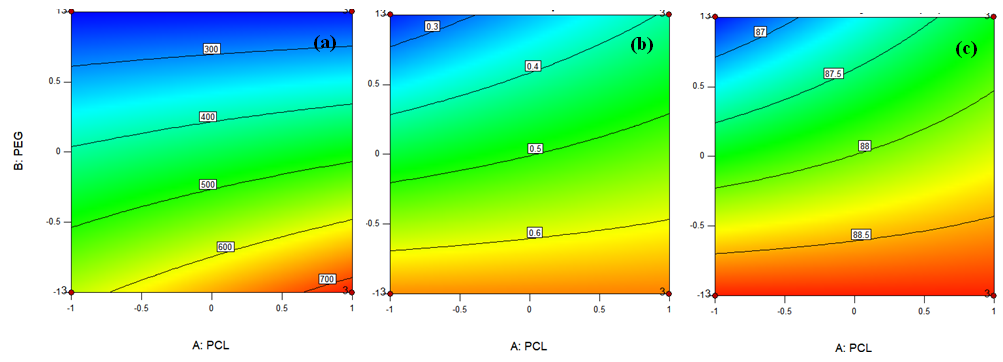Fig. 4: Contour plot interaction of PCL and PEG factors on the observed responses toward PS (a), PdI (b), and EE (c)