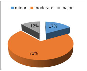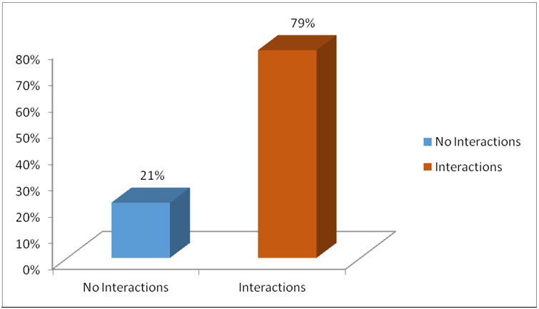 Out of 177 prescriptions, the number of prescriptions without interactions was 21% and the prescriptions with interactions were 79%. Severity assessment of the types of interaction was done. The highest of the interactions observed were moderate (71%), followed by minor (17%) and the least were major interactions (12%) and the findings of this data were similar to a study conducted by Mateti UV et al. [18].