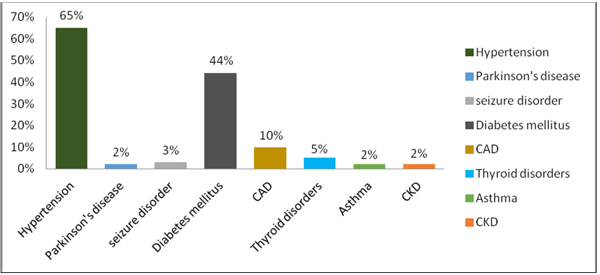 The most common co morbidity associated with stroke was hypertension (65%), followed by diabetes mellitus (44%), and coronary artery disease (10%). The least were asthma (2%), Parkinson’s disease (2%), thyroid disorders (5%), seizure disorders (3%) etc. This was similar to a study conducted by Kumari IN et al. [20]. Patient with more than 5 drug interactions had higher number of co-morbidities when compared to patients with less than 5 drug interaction.