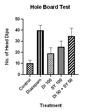 Hole board test is a simple method used to measure the response of animals in an unfamiliar environment. It is one of the widely used models to study the effect of several anxiolytic agents including the bioactive compounds that are obtained from different sources. It is believed that the changes in the emotional state of an animal could be reflected in the head-dipping behaviour and the anxiolytic drugs may increase the number of head dips [17]. The test compounds, Diosgenin and Silymarin upon oral administration, increased the number of head dip counts, both independently and in combination. The combined effect was found to be greater than their individual anxiolytic effect.