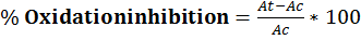 The antioxidant activity was performed under the methodology described by Rojano et al. [7], with modifications, for which different concentrations of the samples (100, 200, 500 and 1000 μg/ml) were prepared, from the prepared dilutions 500 μl were taken and mixed with 500 μl of olive oil (previously oxidized using the TBARS method) in 2 ml eppendorf tubes. In addition, BHT standards (Butyl hydroxytoluene) were prepared at the same concentrations as the sample and similarly mixed with 500 µl of oxidized oil. Samples and standards remained at 28 °C for 8 h in the micro incubator with constant agitation at 400 rpm. After this incubation process, 1 ml of 1% thiobarbituric acid was added to each sample. The prepared samples remained in the micro incubator at 95 °C for 60 min at 400 rpm, then they were cooled and the spectrophotometer was measured at a wavelength of 532 nm. The antioxidant activity was expressed as % oxidation inhibition by the following equation: