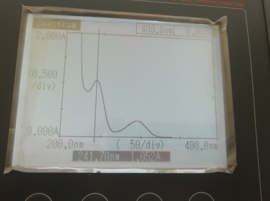 Appropriate volume 5 ml of standard stock solution of clenbuterol hydrochloride was transferred into a 10 ml of volumetric flask, diluted to a mark with distilled water to give concentration of 50μg/ml. The resulting solution was scanned in the UV range (200-400 nm), clenbuterol hydrochloride showed absorbance maximum at 242 nm (fig. 2).