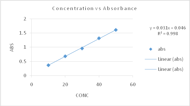 Different aliquots of clenbuterol hydrochloride in the range 1-5 ml were transferred into series of 10 ml volumetric flasks, and the volume was made upto the mark with distilled water to get concentrations 10, 20, 30, 40 and 50μg/ml, respectively. The solutions were analysedin the UV range on spectrophotometer. The spectrum was recorded at 242 nm. The calibration plot was plotted as absorbance vs. concentration.