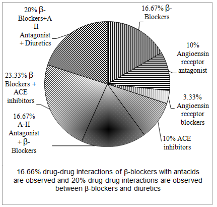 Antacids are more frequently used by physicians with β blockers although there is drug-drug interaction among them. This is due to hypertensive patients usually suffer from acidity problems (table 5). But this combination causes decrease in absorption of β1 selective blocker drug. This type of interactions is avoided by prolong medication of β blockers and frequent monitoring B. P. of hypertensive patient by regular F/O. From the survey it is observed that 36.66% drug interaction observed among the all prescription. Therefore, it seems that although there is prolong medication and combination drug therapy to avoid drug-drug interaction of β-blockers but more number of drug-drug interactions are observed in case of β-blockers. Physicians are aware about drug-drug interaction of β-blockers but there are frequent cases of drug-drug interactions of β-blockers. Although there are more number of drug-drug interactions of β-blockers all over about 60% physicians are still prescribing β-blockers to treat hypertension. Therefore, it is needed to observe drug-drug interaction of β-blockers among various combinations to avoid it.