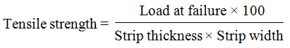 Tensile strength is the maximum stress applied to a point at which the strip specimen breaks. It was calculated by the applied load at rupture divided by the cross-sectional area of the strip as given in the equation below: