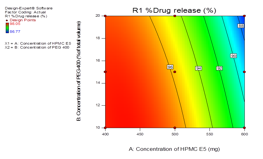 Both the independent variables X1 and X2, had a negative effect on %CDR. As the concentration of X1 and X2 increases from-1 to+1, %CDR was found to be decreasing. This can be clearly seen in the contour plot as shown in fig. 5. In general, it was found that the presence of hydrophilic additive (PEG 400) in HPMC E5 resulted in a rise in the release rate of the drug.