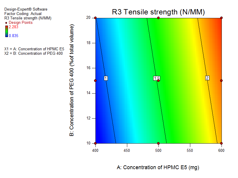 The mechanical properties of cast films were examined by tensile testing. Linear model was suggested showing that tensile strength increased with the increased concentration of PEG 400 and HPMC E5 as seen from the contour plot (fig. 7). No interaction effect or second-order interaction affected the mechanical strength of the casted films. This might be due to the penetration of PEG chains into HPMC E5, leading to crosslinking and an increase in mechanical strength.
